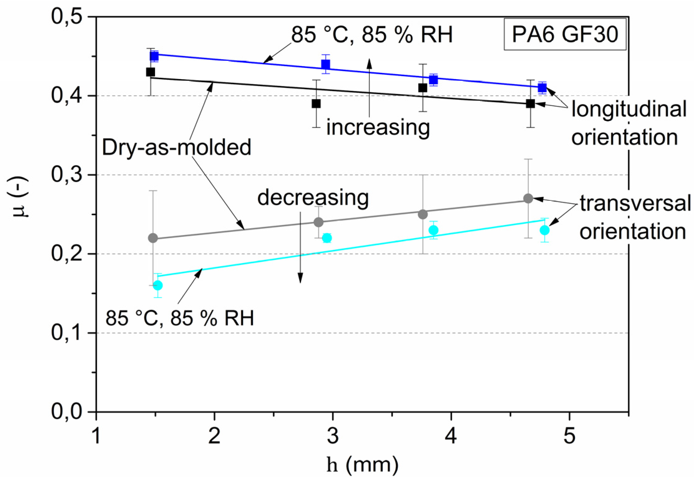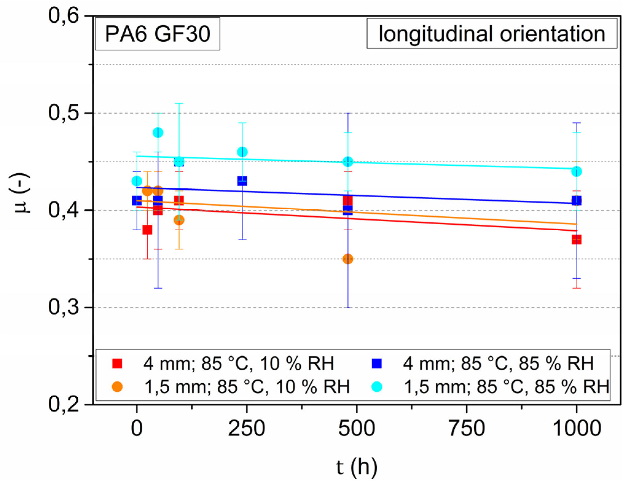 As already mentioned by Kunz [11], Saechtling [12] and Bierögel and Grellmann [13], the Poisson’s ratio in fiber-reinforced thermoplastic materials strongly depends on the fiber content. It is used in the design of mechanical components in FEM programs (Finite Element Methods) for the calculation of multi-axial stresses. Here, among other things, the change of the maximum shear stress criterion (von-Mises criterion) is often used [14]. Through a hygrothermal stress of PA6 GF materials, the absorption of water molecules by diffusion processes takes place as a function of relative humidity and is linked with a decrease of strength and stiffness due to the softening effect of the water inside the polymeric material. Otherwise the ductility and toughness of these materials strongly increase with the water content. This characteristic material behavior could be supported by chemical aging processes such as hydrolysis or oxidation (according to Kohan [15] and Becker and Brown [16], these processes start to impact PA6 from a temperature of about 80 °C), but could also be impeded by counteracting physical aging processes such as recrystallization.