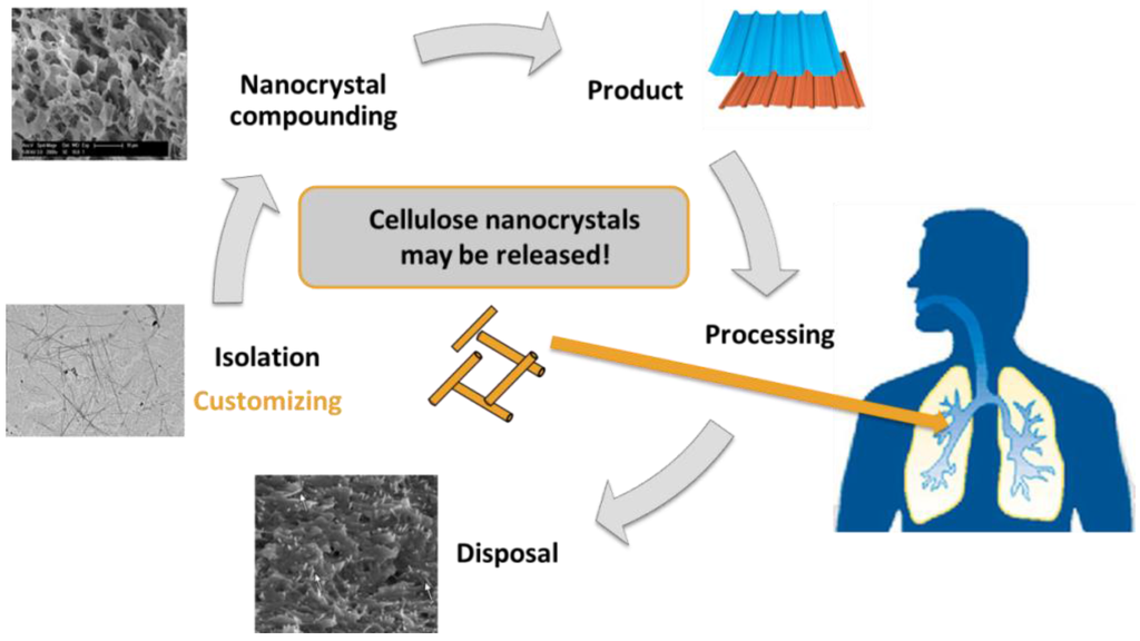 For the subsequent compounding and usage (i.e., product) of CNC-based materials there is also a risk of exposure, albeit it can be assumed to be much smaller than during the initial isolation of CNCs. During these latter stages of the life-cycle, the risk of exposure can mostly be attributed towards the possible abrasion of the product, which could result in the release of individual CNCs, small CNC aggregates, or nanocellulose-polymer composite (nano)particles, which could be subsequently inhaled or penetrate through the skin upon contact. Recent research on this matter has again focused upon CNTs [51,52,53]. From these initial studies it has been postulated that the release of CNTs, at least in their bare form and also combined with polymer matrix is relatively low. Specific exposure levels are not yet known and therefore additional research must be conducted. Furthermore, in terms of usage, it should also be noted that there could be direct exposure to the human body via ingestion (e.g., nanocellulose in contact with food products, such as in food packaging) and also there is the potential injection into the human bloodstream (e.g., the use of nanocellulose as a tool within nanomedicine). These latter aspects, however, are currently of minor importance, as the use of nanocellulose as main components in such food-related and/or medical devices do not appear to be imminent. However, due to their potential application in these contexts, hazard assessment of these scenarios should be undertaken in order to obtain clear risk analysis data, as previously shown by Bergin and Witzmann (ingestion of nanomaterials) [54], as well as for medical application (i.e., injection) [55].