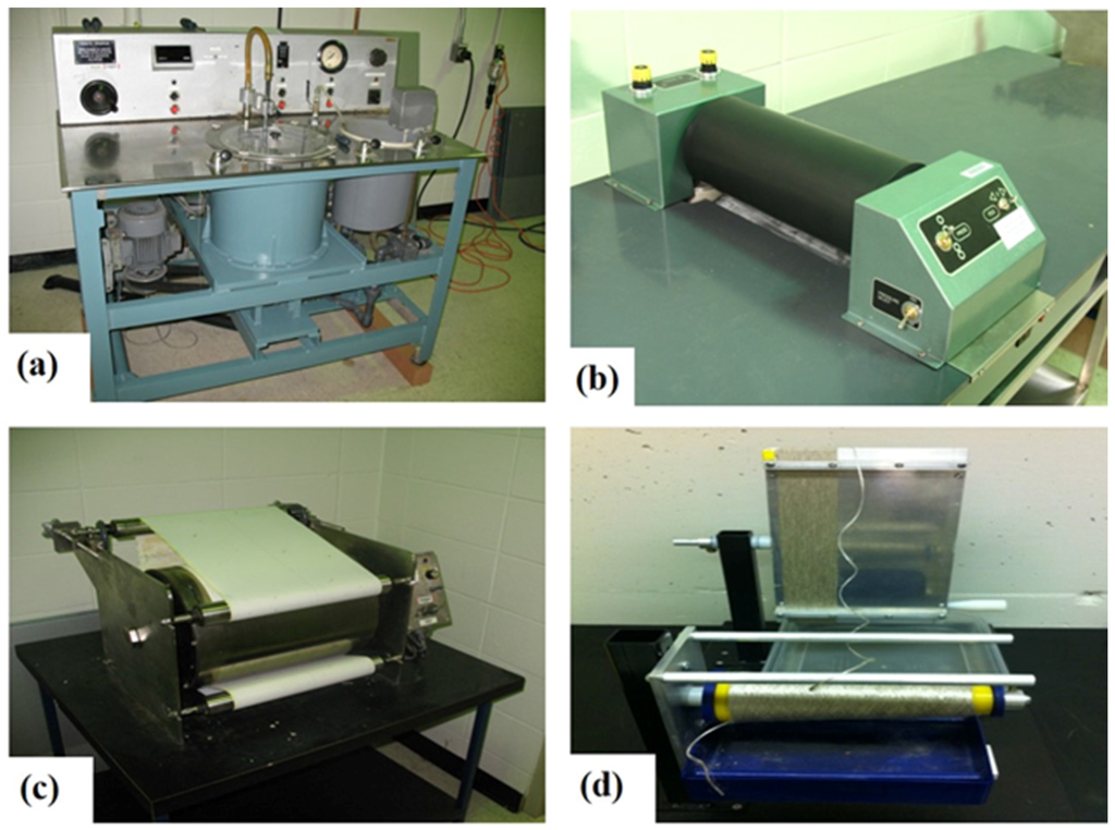 Figure 1a). The fiber slurry with desired consistency is stored in the on-board tank and the mixture is pumped up to the projection nozzle located inside the spinning drum. The mixture is sprayed across the width of the forming wire through the nozzle moving up and down with a constant speed for a specific number of cycles, finally giving a thin and wet paper layer of uniform surface density. This process is well suited for making wet sheets with Kraft pulp. The process had to be adapted for processing flax fibers.