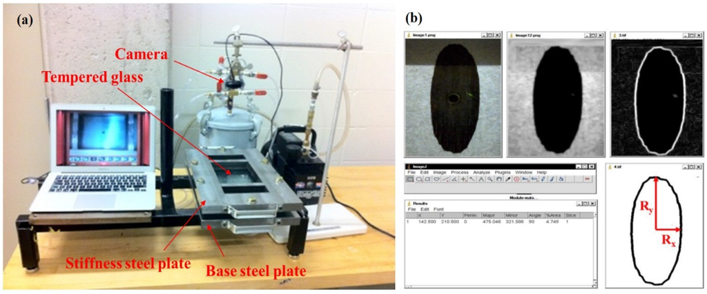 The camera was mounted on a support, placed directly above the mould assembly, and connected to a computer. Using an image-processing technique, the best fit ellipses of the flow front, drawn over time, are used to compute the instantaneous ellipse radiuses