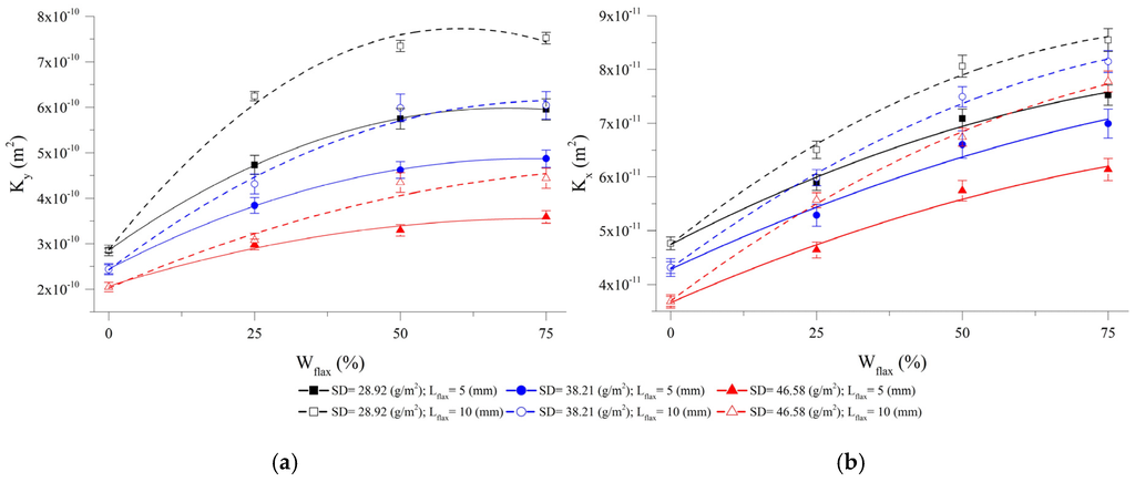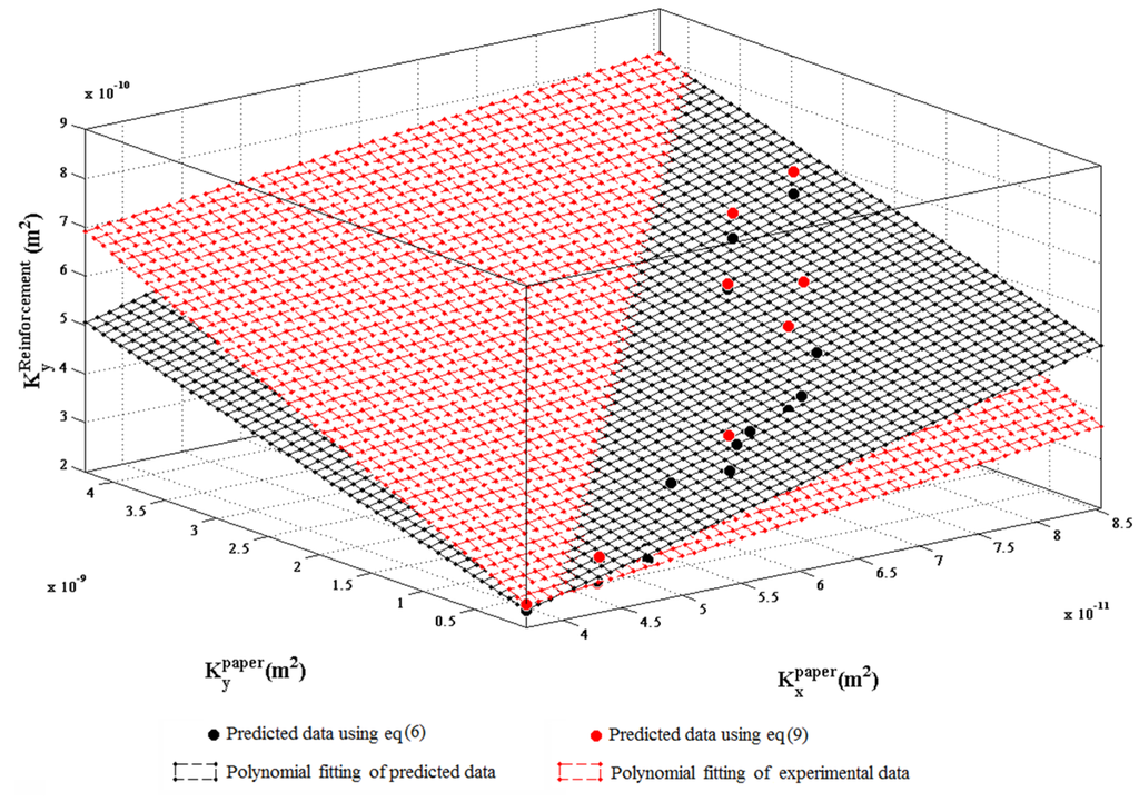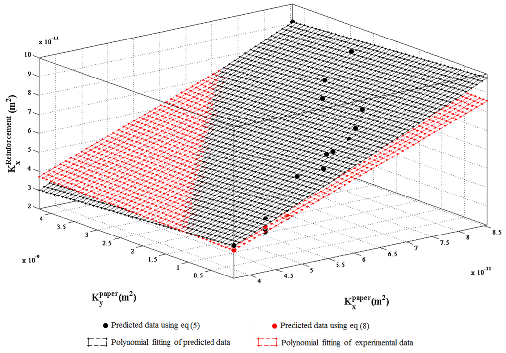 Prediction models of the reinforcement’s permeability as a function of paper and flax yarns layers’ individual permeability were then obtained. One model was obtained by regressing the experimental values while another was obtained by regressing theoretically predicted values using Equation (8). Both models gave almost identical results.