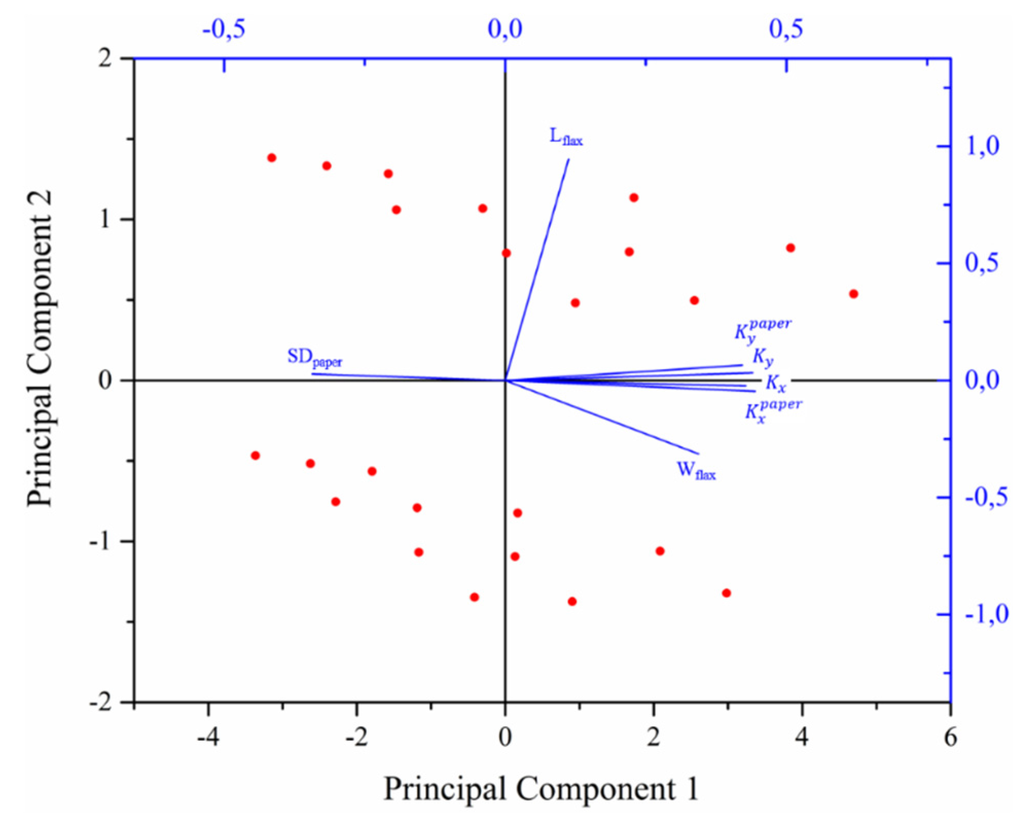 A principal component analysis (PCA) analysis was performed. The permeability Kx and Ky of the whole reinforcement lay close to those of paper layer planar permeability. This confirms that the controlled parameters, all related to the paper layer structure, affect the paper layer permeability in the same way that they affect the global reinforcement’s permeability.