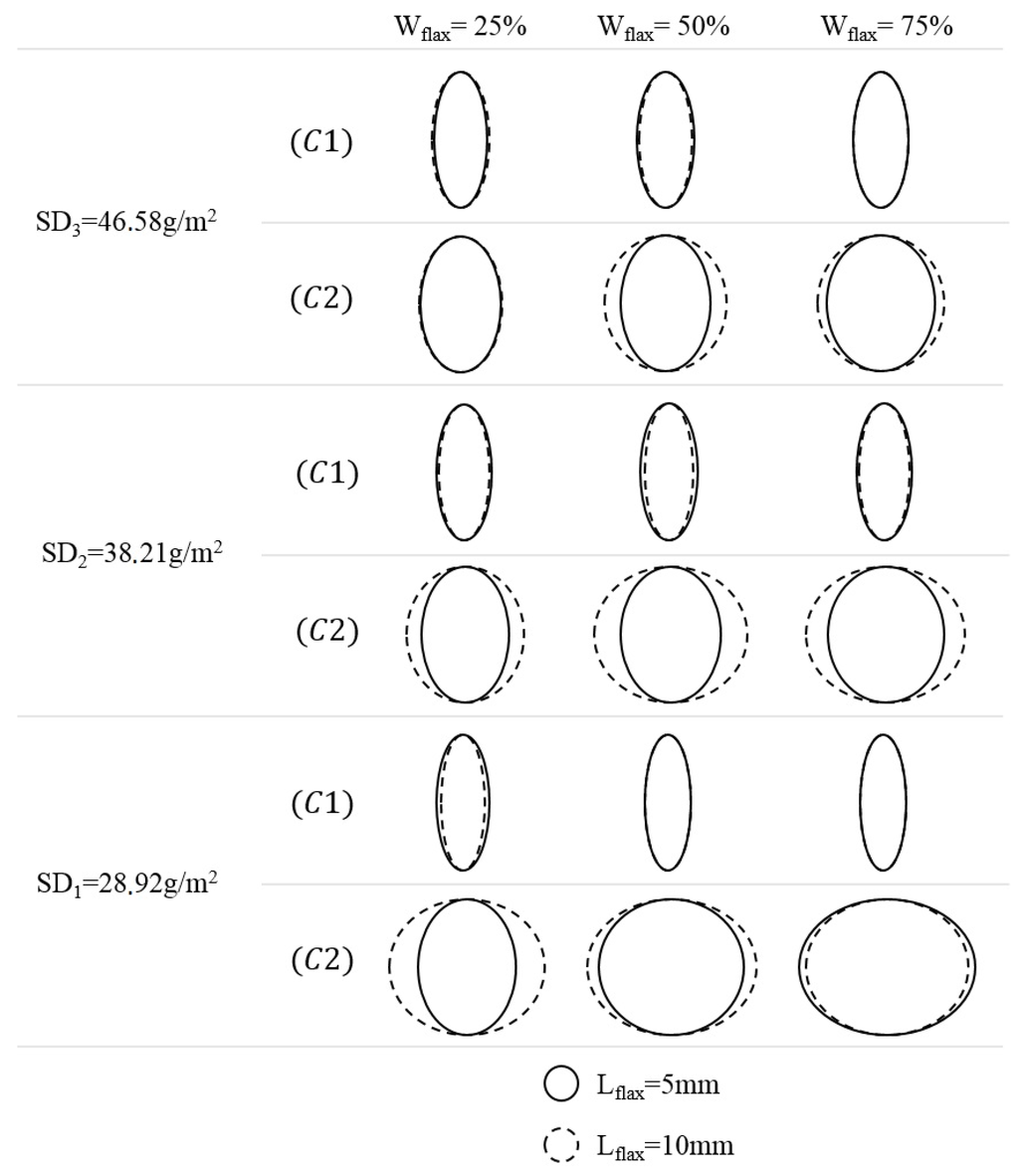 Equations (9 and 10) are used again to predict the permeability of a reinforcement in both principal directions, but this time the paper layers are given different MD-CD orientations with respect to the flax yarns. The flow front shape type is itself predicted using the ratio in Equation (11) [