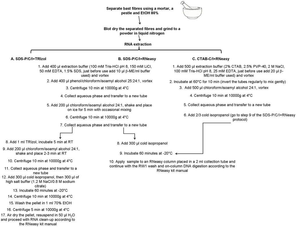 The fibres were subsequently quickly blot-dried using autoclaved wipers (WypAll, Kimberley-Clark, Muller & Wegener, Luxembourg) and immediately frozen in liquid nitrogen. They were then ground to a fine powder using liquid nitrogen, a mortar and a pestle. Approximately 100–150 mg of frozen powder were aliquoted in 2 mL round-bottom Eppendorf tubes and stored at −80 °C until extraction. The ground bast fibres were then subjected to the four different RNA extraction protocols detailed below.