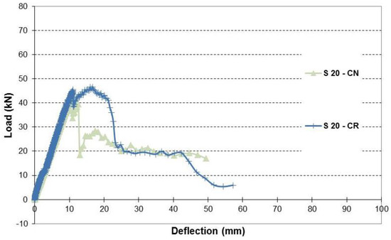 Load-deflection relationship of beams with simulated 20% corrosion level.