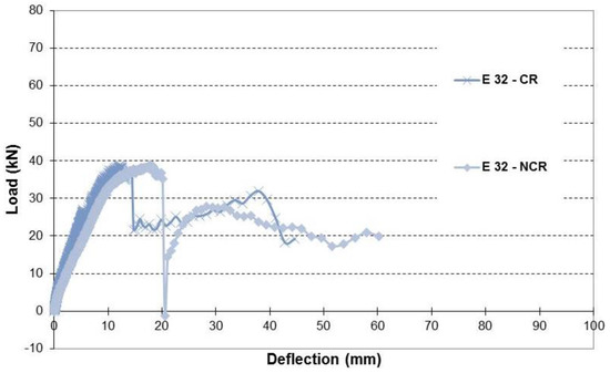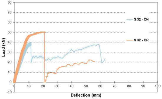 Load-deflection relationship of beams with simulated 32% corrosion level.