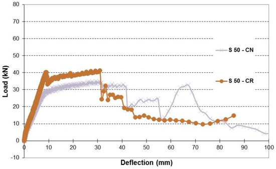 Load-deflection of control beam and beams with 50% corrosion level.