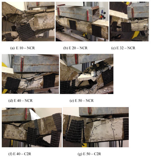 | E 40–NCR | Debonding of CFRP, splitting crack on the unclamped side, crushing of top concrete, and a slight peeling failure of concrete cover. |