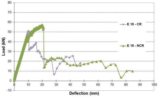 Load-deflection relationship of beams with simulated 10% corrosion level.