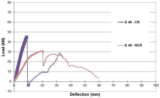 Load-deflection of control beam and beams with 40% corrosion level.