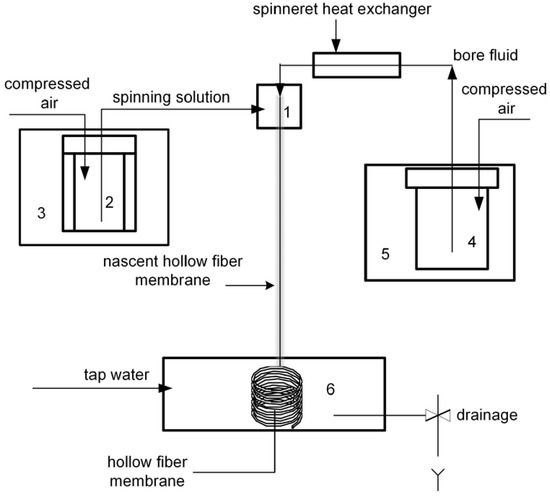 Functional diagram of the setup used for spinning of hollow fiber membranes. 1—spinneret; 2—tank for the spinning solution; 3—thermostat; 4—tank for the bore fluid; 5—thermostat; 6—coagulation bath.