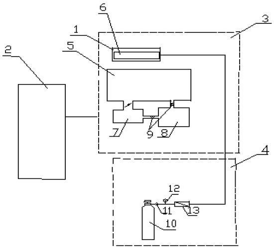 Functional diagram of the pilot scale setup for hollow fibers modification. 1—plasmatron; 2—HF generator; 3—vacuum module; 4—gas supply system; 5—shutter; 6—hollow fiber membrane; 7—diffusion pump; 8—forvacuum pump; 9—valves; 10—gas pressure tank; 11—reducing valve; 12—standard pressure gauge; 13—variable area flow meter.