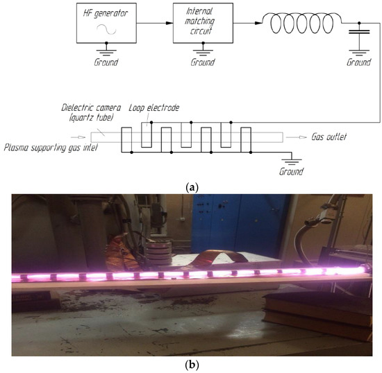 (a) Gas discharge chamber electrode connection diagram; (b) Experimental gas discharge chamber for hollow fiber membranes treatment.