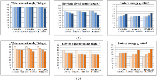 Finally, etching solution temperature plays a key role. When comparing data shown in Figure 9a,b, it can be observed that water contact angle change is small to negligible when etching solution has room temperature, while under elevated temperature (50 ± 2 °C) contact angle values decrease drastically. Similar alteration is observable for free surface energy which, in the case of 5 wt. % sulfuric acid solution, increases from 26 to 39 mJ/m2 with temperature rise from 23 to 50 °C. Probably, increasing the temperature leads to chemical transformation accelerating on the membranes surface.