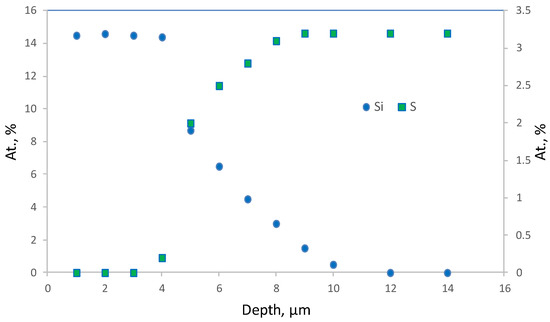 Figure 12 shows Si and S elemental profiles for selective top layer fragment (Figure 11b) obtained by the electron probe microanalysis (EPMA) technique. It can be seen that silicon concentration is maximum on the membrane surface and decreases with probing depth increase. It is demonstrated that significant amount of silicon (and therefore PTMSP) penetrates into the membrane up to 10 μm.