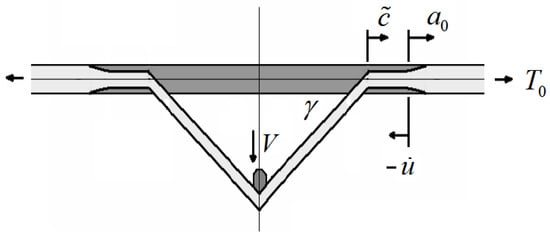 We assume an initial tension, , leading to pre-strain, , but to simplify the analysis we ignore tensile wave collision effects under the projectile (see Figure A1) though we understand that these still cause a tensile strain concentration in addition to the interference effect caused by the transverse shock wave. Thus, from the geometry, the changes in length for the fibers at the projectile surface (where the relevant velocity is ) and the distant surface (where the relevant velocity is ) are, respectively,