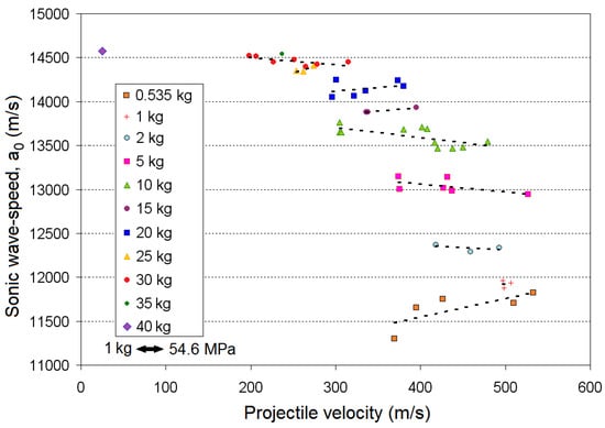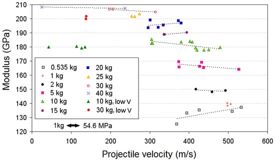 Cunniff [5] also uncovered certain anomalies in the predictions, whereby glass and carbon fiber composite panels do not perform as well as predicted, largely because of their previously noted brittle response to sudden transverse loads. Also, based on his assumed mechanical properties for Spectra® 1000 UHMWPE yarns, Cunniff [5] found the associated UHMWPE fabrics and composites performed below expectations in that the critical value, , had to be artificially reduced by 16% in order for Equation (1) to be able to resolve the data. Cunniff proposed that an effective strength reduction (by about 23%) may be the result of strength loss from thermal softening connected to the relatively low melting point of UHMWPE fibers compared to the higher thermal stability of other polymeric fibers, such as aramids and virgin PBO.