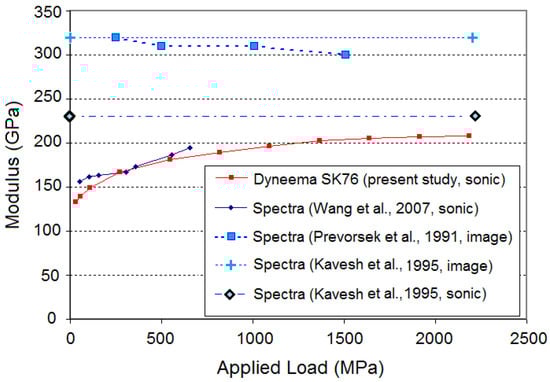 For the razor-edge impact experiments of Wang et al. [16], the extent to which the results yielded the strength of the two types of yarns is unclear, but the values quoted for Spectra® 1000 and Kevlar® were 715 MPa and 555 MPa, respectively, or about 1/5th the values found from quasi-static tension tests. At ballistic loading rates the fiber modulus values obtained were about half those obtained by Prevorsek et al. [20] and Field and Sun [27], though were consistent with the high strain-rate values obtained by Lim et al. [13]. Later on, Kavesh and Prevorsek [28] referred to an unpublished report wherein a Young’s modulus of 230 GPa was calculated from a directly measured, tensile wave-speed in Spectra® fiber, though the exact version and level of pre-tension was not specified.