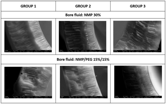 Morphology of the fibers spun from experiment Groups 1–3 using two different bore fluids (NMP 30% and NMP/PEG 15%/15%).