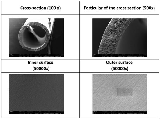 The produced fibers showed a thickness between 0.2 and 0.3 mm; porosity between 65% and 77% and a tensile modulus from 115 to 200 N/mm2. The PWP experiments showed a permeability ranging from 51 to 81 L/hm2 bar. In particular, the fibers from group 1 presented a permeability of 53–70 L/hm2 bar; fibers from group 2 presented a permeability of 51–66 L/hm2 bar; while the fibers from group 3 had a permeability of 61–81 L/hm2 bar.