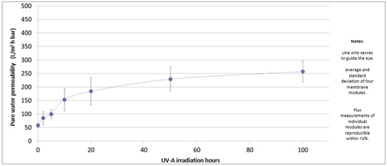 Stability tests were carried out by comparing the pure water fluxes with and without UV-A-irradiation. For the stability tests, 10 modules of each membrane hollow fiber type (with or without TiO2) were prepared and submitted to the wetting and integrity check. Each module contained three hollow fibers. Of the defect-free modules in the wetting equilibrium, five modules were kept in the dark and five modules were irradiated.