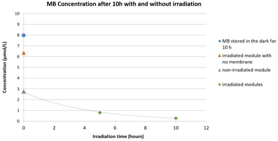 Qualitative concentration change of the aqueous methylene blue (MB) solution: Blue circle: MB solution stored in the dark for 10 h; orange triangle: irradiated module filled with MB solution but not containing any fiber; grey triangle: non-irradiated module containing PES+TiO2 hollow fibers (HF); green diamond: irradiated module containing PES+TiO2 HF.