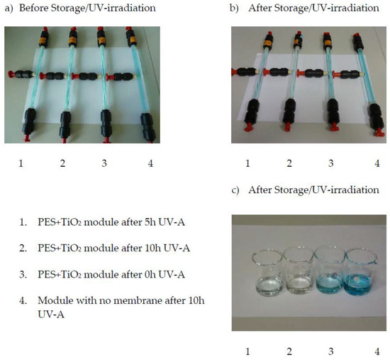 Figure 9 shows the membrane modules 1, 2, and 4 before (a) and after (b) UV-A irradiation. Module number 3 was not exposed to UV-A light and is added for comparison. The color of the solutions drained from these modules can be compared in Figure 9c. (The corresponding absorbance is given in Figure 8). The photo-catalytic activity of the TiO2 nanoparticles contained in the PES membranes was in fact allowed to almost totally degrade the MB.