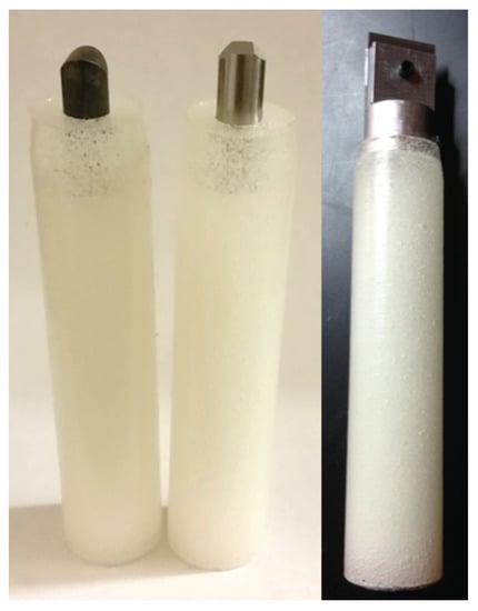 Three different high performance yarn materials have been used to assess both the longitudinal and transverse stress wave characteristics, namely Dyneema® SK76, Kevlar® KM2 and AuTx®. Quasi-static mechanical properties of all said fibers are displayed in Table 1. Dyneema® SK76 and Kevlar® KM2 yarns were selected as candidate materials due to their regular occurrence within current body armor systems, while AuTx® yarn was selected as it is a prospect for future armor systems. Yarns were impacted with three different projectile nose geometries, namely razor blade, 0.30-caliber (cal) fragment simulating projectile (FSP) and 0.30-cal round. An image of the three different projectile heads can be found in Figure 1. Further description of the experimental setup and procedures can be found in Hudspeth et al. [].