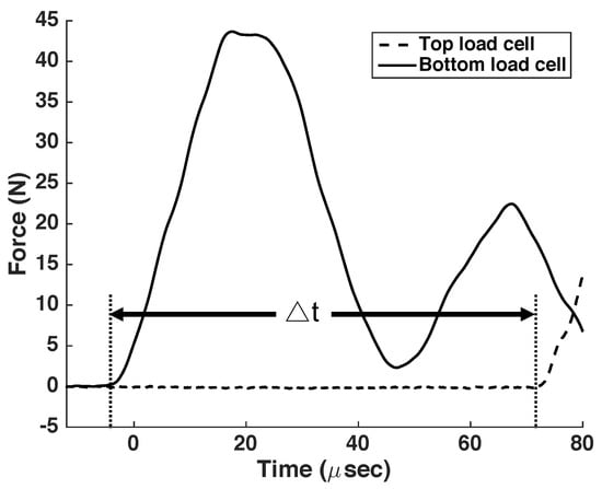 As previously stated, without sufficient framing rates, both and can only be estimated with a low level of precision. In order to circumvent this high variability measurement, a more appropriate method has been pursued wherein one tracks the difference in longitudinal wave travel times from projectile-yarn contact site to the detection of the longitudinal wave from the clamping load cells for drastically different yarn lengths and ; and are measured as 10.3 cm and 73.2 cm, respectively. Such a measurement is described in Equation (10) and is demonstrated in Figure 3. As previously stated, possessing accurate and is achieved using a laser bore site, allowing for Equation (10) to provide an accurate estimate of the wave speed of the yarn material. As an aside, it is important to note that the longitudinal stress wave must also travel through the yarn clamping fixtures, but accounting for this travel time is unnecessary if identical clamping fixtures are used on both ends of the yarn; the longitudinal wave travel time through the clamps is identical in both fixtures and is inherently subtracted out using the aforementioned time difference method. Additionally, the time origin in Figure 3 is arbitrary, and time zero has been set to the instant the data collection system is triggered; thus, a rough calculation of the projectile impact time is −20 s to 41.5 s within Figure 3, including wave travel through yarn and clamp.