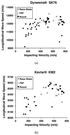 Measured longitudinal wave speeds of (a) Dyneema® SK76 and (b) Kevlar® KM2 when impacted with razor blade, FSP and round projectiles.