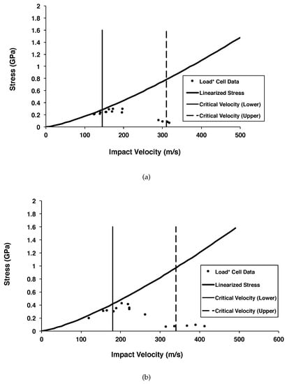 From Equation (15), it can also be seen that changes in failure stress result in a more rapid increase (and decrease) in critical velocity, as compared to proportional changes in failure strain. For example, a 10% increase in failure stress results in a critical velocity of 524.4 m/s, while a 10% increase in failure strain results in a critical velocity of 512.1 m/s. Figure 16 demonstrates the variation in critical velocity due to the modification of either exclusively failure stress or exclusively failure strain.