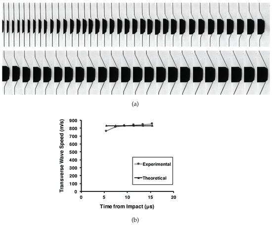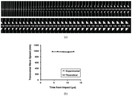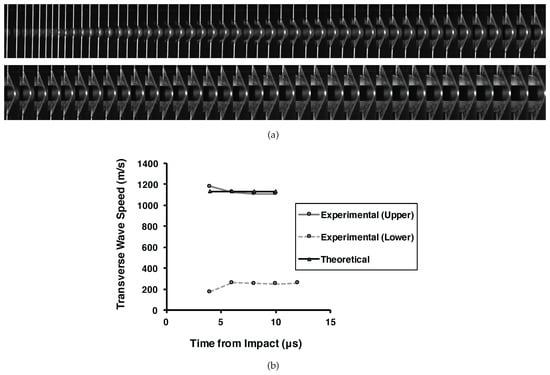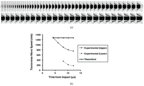 (a) Image sequence of an FSP transversely impacting into a single AuTx® yarn at 806 m/s (above the critical velocity transition regime []), along with (b) corresponding measurement of transverse wave speed overlaid with the theoretical value predicted by Equation (5).