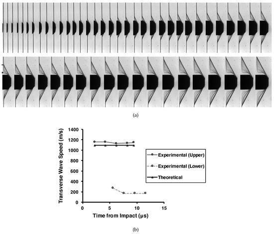 Along with determining the effect of impact velocity on the longitudinal wave speed, it was also deemed of use to assess the transverse wave velocity as a function of impact velocity. This transverse wave, which is described by Equation (4) in Section 1, presents itself in a tent formation, thereby allowing direct tracking of wave velocity using high-speed imaging. An example of this transverse wave movement can be seen in the schematic shown in Figure 4. Specifically, attention was placed on movement of the transverse wavefront between several frames, and in tandem with known inter-frame separations, observed transverse wave velocities were calculated for various impacting velocities.