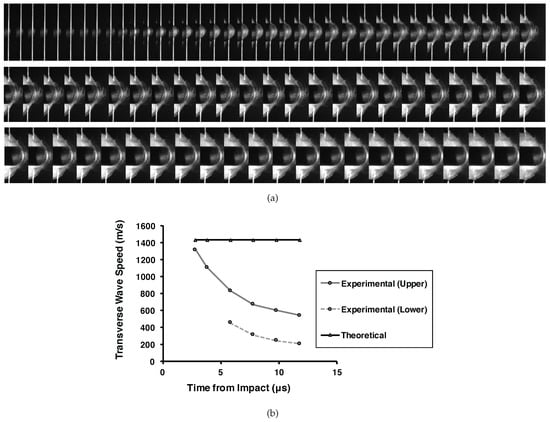 (a) Image sequence of a round projectile transversely impacting into a single AuTx® yarn at 659 m/s (inside the critical velocity transition regime []), along with (b) corresponding measurement of transverse wave speed overlaid with the theoretical value predicted by Equation (5).