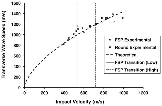 Experimental and theoretical transverse wave velocities for AuTx® yarn shot with both FSP and round projectile geometries.