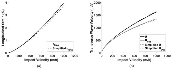 In order to demonstrate the validity of Equations (12)–(14), all three relations have been solved for a range of impact velocities up to 1 km/s and are plotted in Figure 14 using mechanical properties exhibited by Kevlar® KM2. Figure 14a compares the full solution (6) and simplified solution (14) of the tensile strain developed behind the longitudinal wave front, showing very good agreement, with the simplified solution tending to be slightly less than the full solution. Figure 14b compares the variation in the full solution and simplified solution of the transverse wave speed in both a reference onboard the yarn (Equations (4) and (12), respectively) and from the reference of a laboratory observer (Equations (5) and (13), respectively). Both comparisons show very similar results between the full solution and simplified solution with the partial solution of U tending to slightly overpredict the full solution and the partial solution of tending to slightly underpredict the full solution. Thus, the following assessment of mechanical property evaluation on the resulting critical velocity uses the simplified set of equations for ease of analysis.