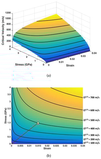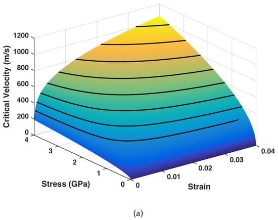 An array of values of and are then input into Equation (15), yielding a critical velocity surface, which can be seen in Figure 15a. Additionally, iso-velocity curves have been overlaid on top of the velocity surface with curves ranging from 300 m/s–1000 m/s in 100-m/s increments. Take notice of the clear effect that both failure strain and failure stress have on the resulting critical velocity. Increasing either value while holding the other constant shows an increase in critical velocity, but simultaneous increases in both are clearly the most preferable.