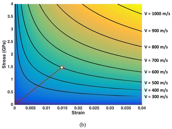 (a) Variation in the Cunniff parameter, , when varying both the failure stress and failure strain of Kevlar® KM2 yarn material. (b) Stress-strain field overlaid with critical iso-velocity curves; example linear elastic stress-strain response resulting in a Cunniff parameter of 400 m/s.