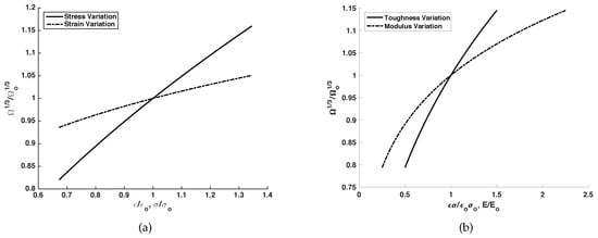 Relative effect of varying (a) the ultimate failure stress or failure strain or (b) the toughness or elastic modulus on the resulting Cunniff parameter, , for Kevlar® KM2 yarn (assuming an initial failure stress and failure strain of 1.49 GPa and 1.49%, respectively).