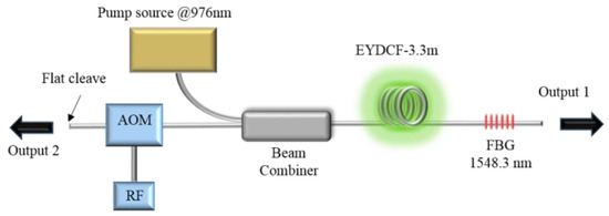 The experimental setup of the proposed actively Q-switched EYDCFL is shown in Figure 1. The EYDCFL has a Fabry–Perot configuration. The gain media is a 3.3 m long EYDCF (CorActive DCF-EY-10/128) (CoreActive High-Tech Inc., Québec, QC, Canada) with core absorption of 85 dB/m at 1535 nm, diameter of 10 µm, NA of 0.20; and first cladding with absorption of 2 dB/m at 915 nm, diameter of 128 µm, and NA > 0.45. The EYDCF is pumped by a 25 W multimode laser source at 976 nm (Focusligth FL-FCMSE55) (Focuslight Technologies Inc., Xi’an, Shaanxi, China) through a pigtailed beam combiner 2 + 1 × 1. An intracavity pigtailed acousto-optic modulator (AOM, Gooch & Housego Fibre-Q T-M200-0.1C2J-3-F2S) (Gooch & Housego PLC, Ilmister, UK) driven by a radio frequency (RF) signal is used to generate Q-switched pulses. The cavity is formed between the 4% Fresnel reflection from the normal cleave of the unconnected AOM fiber end in one side and a homemade fiber Bragg grating (FBG) with 99% reflection at 1548.3 nm spliced to the EYDCF end in the opposite side. The measured bandwidth of the FBG at −3 dB is of 209 pm, which contributes to the linewidth narrowing of the laser emission. The unconnected end of the FBG (output 1) is used to measure the laser spectrum by using an optical spectrum analyzer (OSA, Yokogawa AQ6375) (Yokogawa Corporation of America, Newnan, GA, USA) with a wavelength range from 1200 to 2400 nm and resolution of 50 pm. In the output 1, the laser pulses are also detected by a photodetector and observed in an oscilloscope. The unconnected port of the AOM (output 2) is used to measure the laser average output power by a thermal power sensor (Thorlabs S146C, 900–1650 nm, 20 W) (Thorlabs Inc., Newton, NJ, USA) and a power meter console (Thorlabs PM100D) (Thorlabs Inc., Newton, NJ, USA).