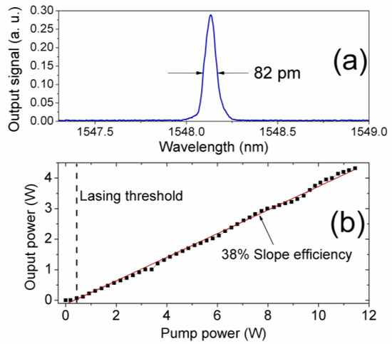 In Figure 2, the EYDCFL spectrum and output power in continuous wave (CW) operation is shown. The experimental results were obtained without the AOM within the laser setup. The unconnected port of the beam combiner was normal cleaved, acting as a 4% reflector to limit the cavity. The aforementioned fiber end is also used as output 2 to measure the output power of the laser. Figure 2a shows the output laser spectrum measured with the OSA. The laser wavelength is generated at a central wavelength of 1548.3 nm with full width at half maximum (FWHM) linewidth of 82 pm. The maximal pump power applied in CW was 11.4 W (maximal pump power for CW laser operation results). The output power dependence on the pump power applied is shown in Figure 2b. The lasing threshold is ~0.5 W of pump power. With the maximal pump power application the output power achieved being 4.32 W, with an efficiency slope of 38%.