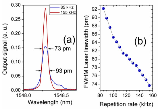 The laser spectrum linewidth evolution as a function of the repetition rate in actively Q-switched operation is discussed in Figure 3. The measurements were obtained with a pump power of 6.5 W. Figure 3a shows the laser output spectrum at the repetition rate limits in which stable Q-switched pulses are observed. With the minimal repetition rate of 85 kHz (blue curve), the spectral FWHM linewidth is 92.2 pm while a linewidth of 73 pm is achieved with a maximal repetition rate of 155 kHz (red curve). The laser line wavelength corresponds to the central wavelength of the FBG of 1548.3 nm. Figure 3b shows the spectral linewidth evolution due to the repetition rate variation. The laser spectral width exhibits a narrowing from 93 to 73 pm as the repetition rate is increased from 85 to 155 kHz.