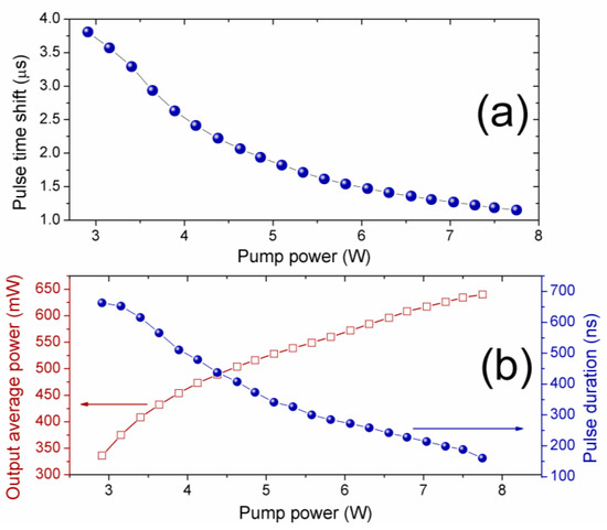 Figure 4 shows the Q-switched pulses evolution as a function of the pump power. The measurements were obtained at a fixed repetition rate of 140 kHz with a pump power variation in a range from 3.1 to 7.7 W, where the maximal pump power for Q-switched laser operation was set to 7.7 W in order to avoid damage of the fiber components. The generated pulse trains exhibit a shift toward shorter times over the AOM triggering time window. The observed pulses behavior impact in the pulses characteristics which depend on the launched pump power. The experimentally obtained time shift of the pulses trains as a function of the pump power is discussed from Figure 4a, in which a single pulse peak, taken as a reference is depicted. As it can be observed (and also noticed from Figure 3a), the time shift is more pronounced when low pump power is applied and is quasi-stabilized with higher pump powers, far above from the lasing threshold. Figure 4b shows the measured laser average output power and pulse duration as a function of the pump power. As it can be expected, with the increase of the pump power, the average output power increases as the pulse stretches. With the maximal pump power of 7.7 W, the maximal average power of 640 mW and the minimal pulse duration of 160 ns are obtained.