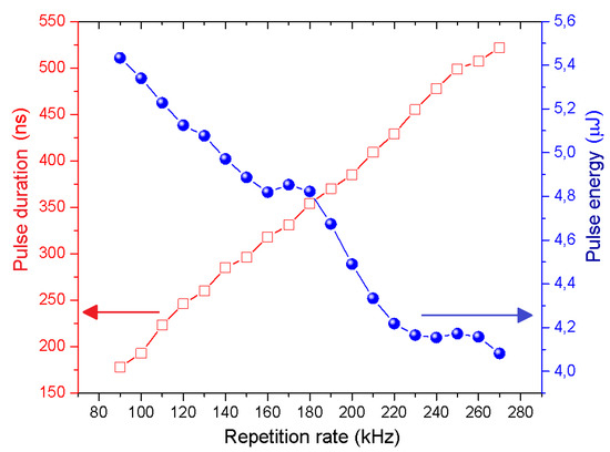 In Figure 5, the measured pulse duration and the estimated pulse energy as a function of the repetition rate of the actively Q-switched EYDCFL are shown. The experimental results were obtained with the maximal pump power limited to 7.7 W to avoid damage on the fiber components. The pulse energy was estimated from the measured average power and the repetition rate. As it can be expected, the generated laser pulses exhibit typical pulse characteristics of the actively Q-switched lasers. With the increase of the repetition rate from 90 to 270 kHz, the pulse duration increases from 178 to 520 ns as the pulse energy decreases from 5.42 to 4.08 µJ. When the repetition rate is decreased above 90 kHz, Q-switched pulses with spurious emission are generated.