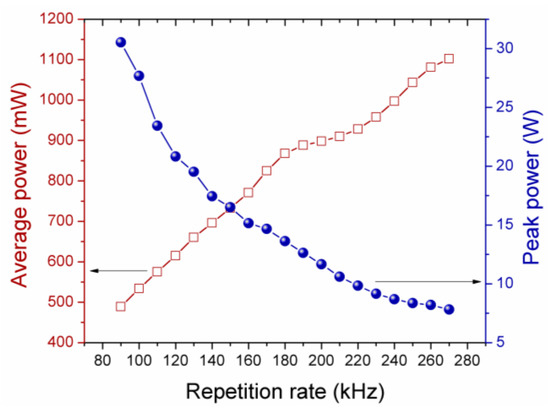 Figure 6 shows the measured average power and the estimated peak power as a function of the repetition rate where stable Q-switched pulses are observed. With the increase of the repetition rate, the average power increases and the peak power decreases (as it can be expected because the pulses widen). The maximal output average power of 1.1 W is achieved with the maximal repetition rate of 270 kHz while the maximal peak power of 30.52 W is obtained with the minimal repetition rate of 90 kHz.
