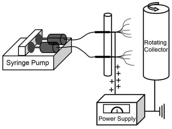 In this work, electrospinning was used to form the polymer fiber templates with the PdCl2 particles and Aluminum acetate/PVP sol gel precursor material in the polymer [,,,,,]. The electrospinning setup is shown in Figure 1 with two metallic needles fed by a syringe pump, a power supply and a rotating drum collector.