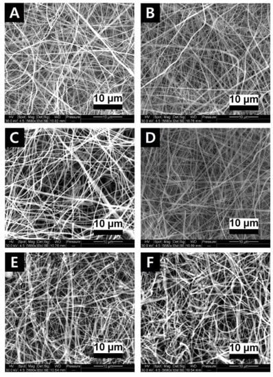 Images (Figure 2) from a scanning electron microscope (SEM) (FEI Quanta 200 at 30 kV and HITACHI TM3000 at 15 kV, FEI, Portland, OR, USA) were analyzed to study the fiber morphologies and to determine the fiber diameter distributions. The diameters were measured directly from the SEM images using FibraQuant 1.3 software (nano Scaffold Technologies LLC, Chapelhill, NC, USA), and were displayed as the fiber size distribution curves as shown in Figure 3. Each histogram was generated out of at least 100 measurements. Energy dispersive X-ray analysis (EDX) (Bruker Quantax 70, Billerica, MA, USA) was used for the elemental quantification analysis.