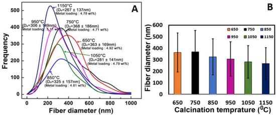 (A): Fiber diameter distributions and (B): Average diameters (labeled as Da and metal loading) of PdO/Al2O3 fibers of fibers calcined at temperatures ranging from 650 to 1150 °C.