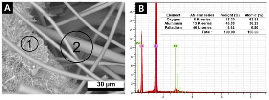 (A) SEM images of palladium doped alumina nanofibers with alumina microfiber in catalytic filter media; and (B) energy dispersive X-ray analysis (EDX) analysis of elemental composition of the circled area marked “1” in Figure 4A.