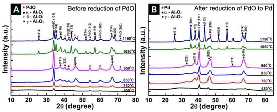 For the PdO/Al2O3 spectra in Figure 6A, the diffraction peaks at 2θ = 34.3° (101), 42.4° (110), 54.3° (112), 60.1° (103) and 71.6° (202), indicate the detection of PdO. After reduction with hydrazine, all PdO peaks shifted toward the right indicating the formation of Pd particles. In comparison, in Figure 6B the peaks at 2θ = 40.4°, 46.9° represent the indices of (111), (200) crystal planes of Pd. Diffraction peaks corresponding to the PdO phase were not observed in Figure 6B, indicating that Pd existed in a different crystal phase of the Pd/Al2O3 fibers after treatment with hydrazine. Upon the increase of the calcination temperature from 650° to 1150°, the diffraction line of Pd (2θ = 40.4°, 46.9°) became apparent and more intense, which could be ascribed to the change in crystallite size.